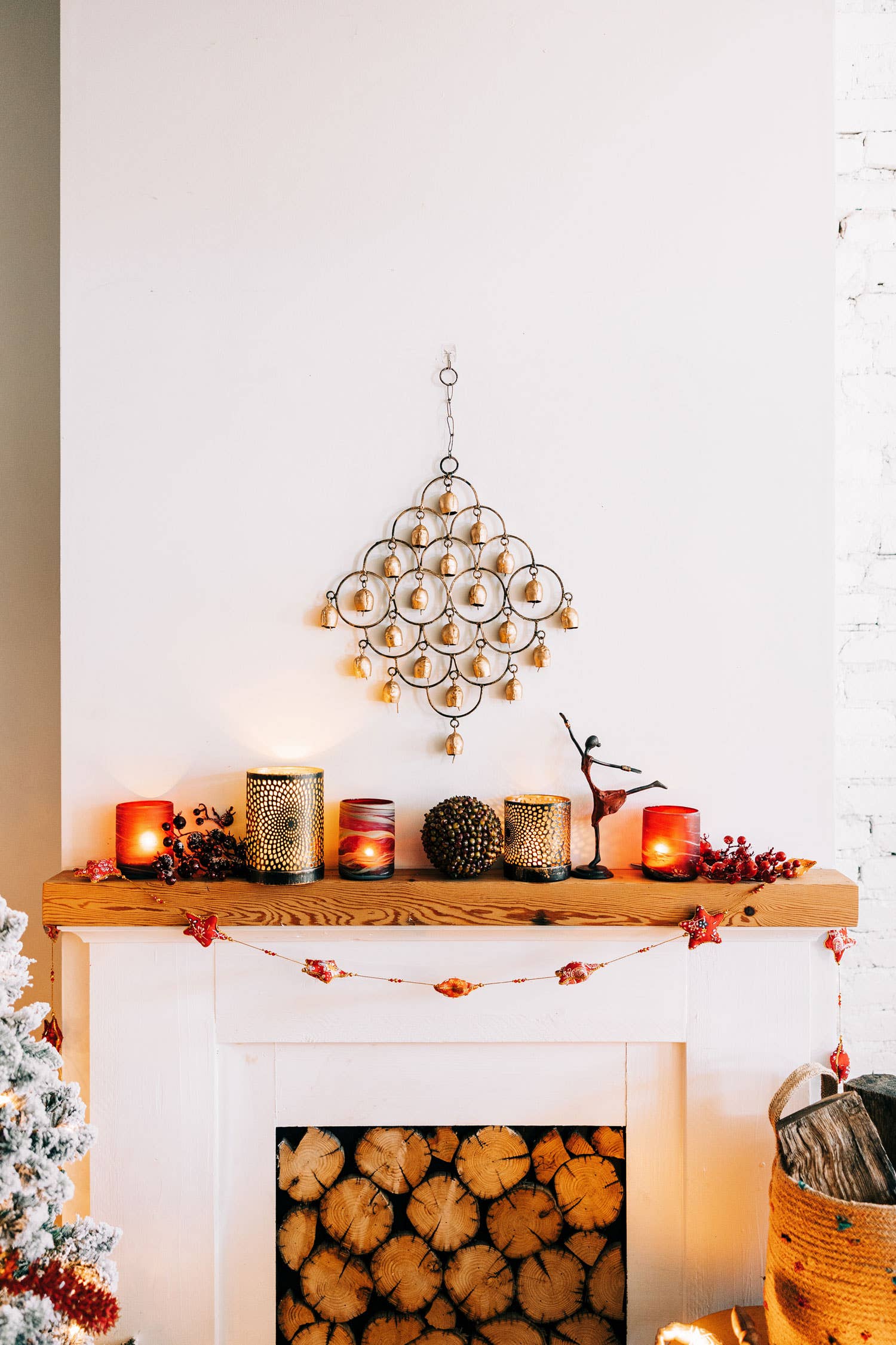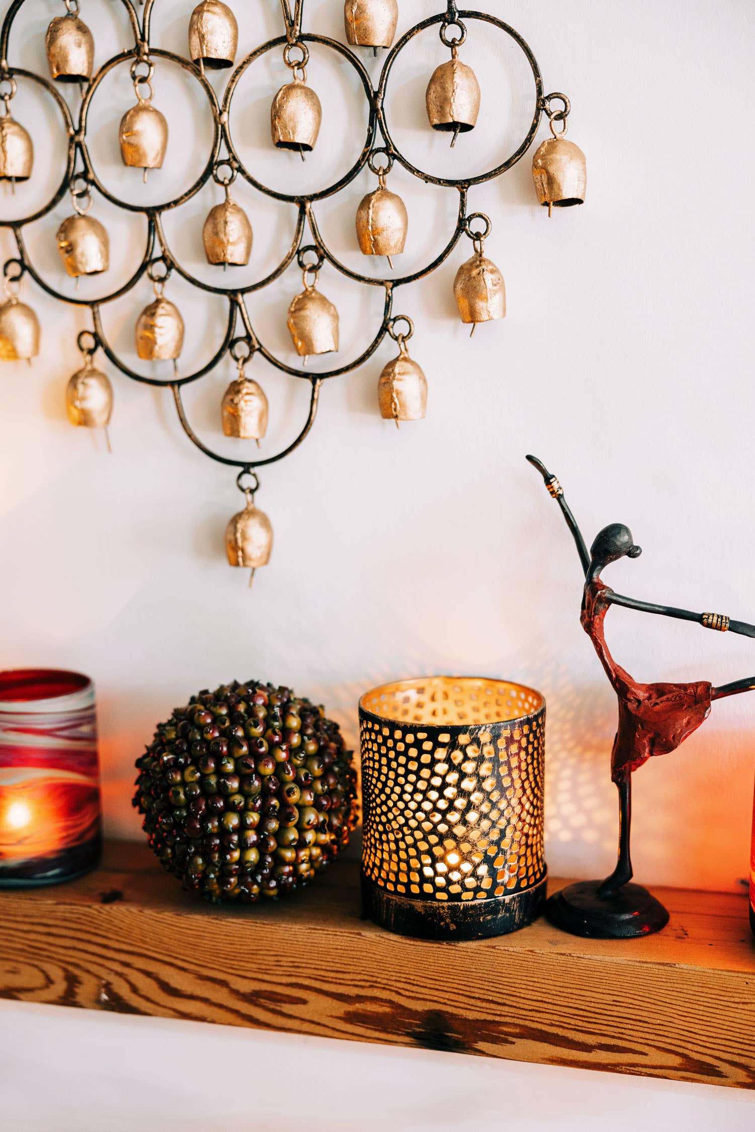 The Chorus of Bells Wind Chime features 23 bells all bringing you unique resonating sounds on the wind. This fair-trade wind chime is handcrafted from iron and will obtain a gorgeous patina when left outside to weather. If you love the sheen on the bells, keep it indoors, or under cover to protect from patina. Iron with gold colored finish - Natural patina will occur when left in the elements. - Chime is approximately 14"x14" excluding chain - Hangs from a 4" chain - Handcrafted in India