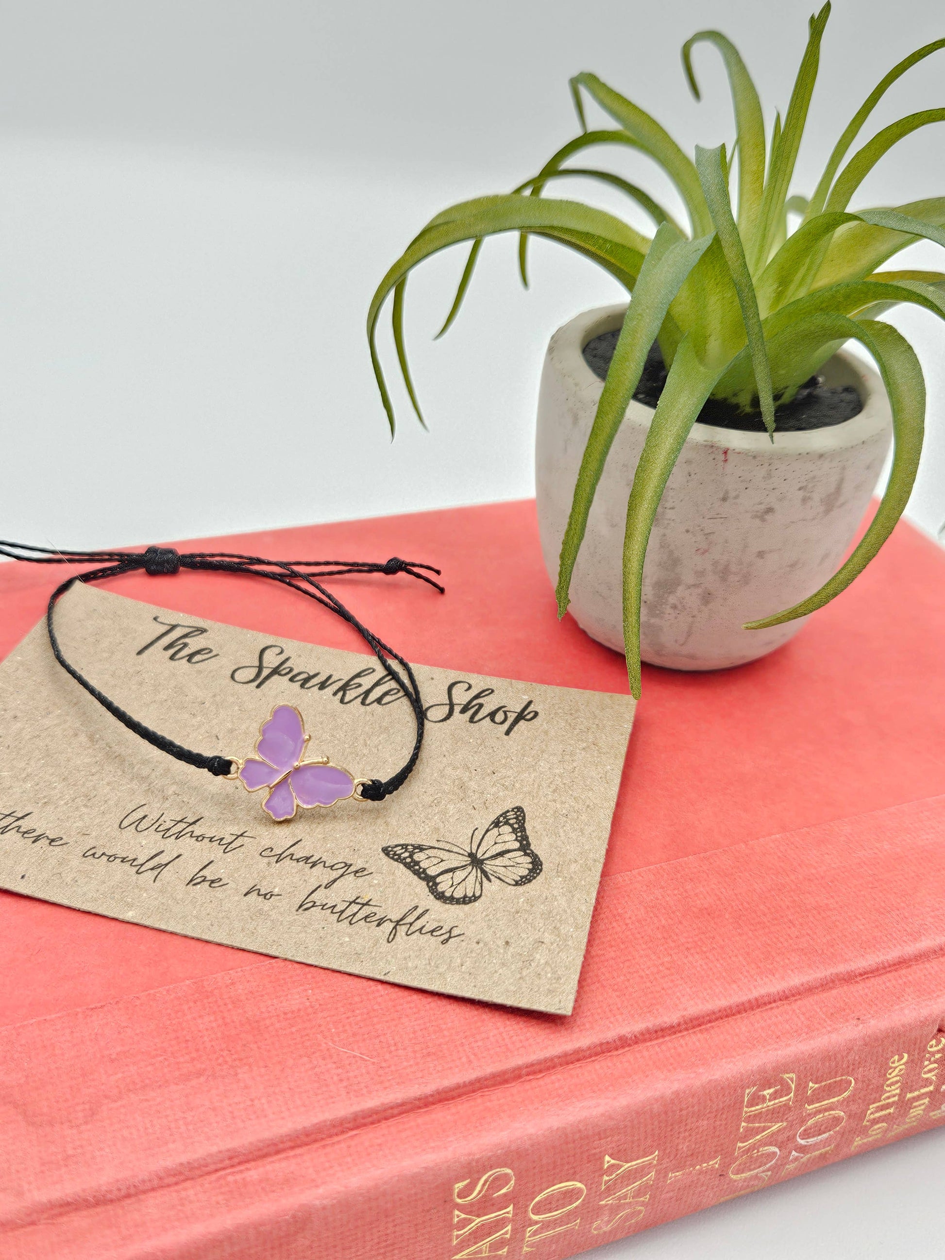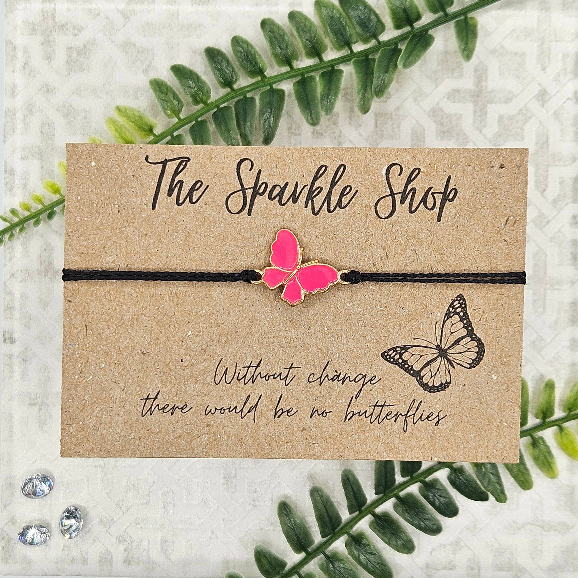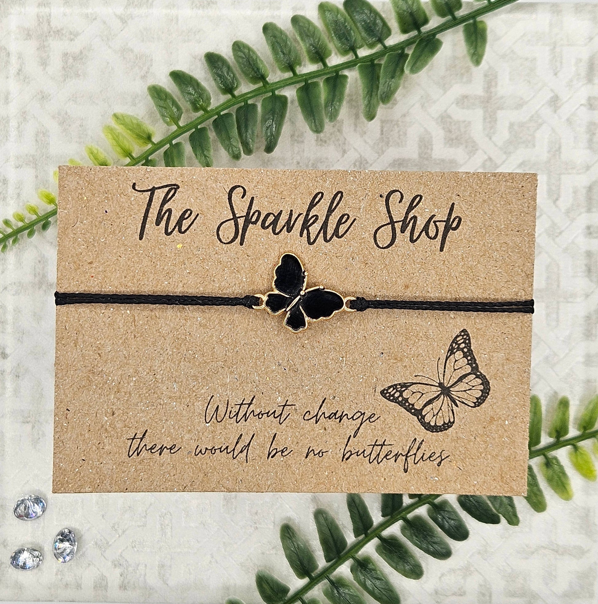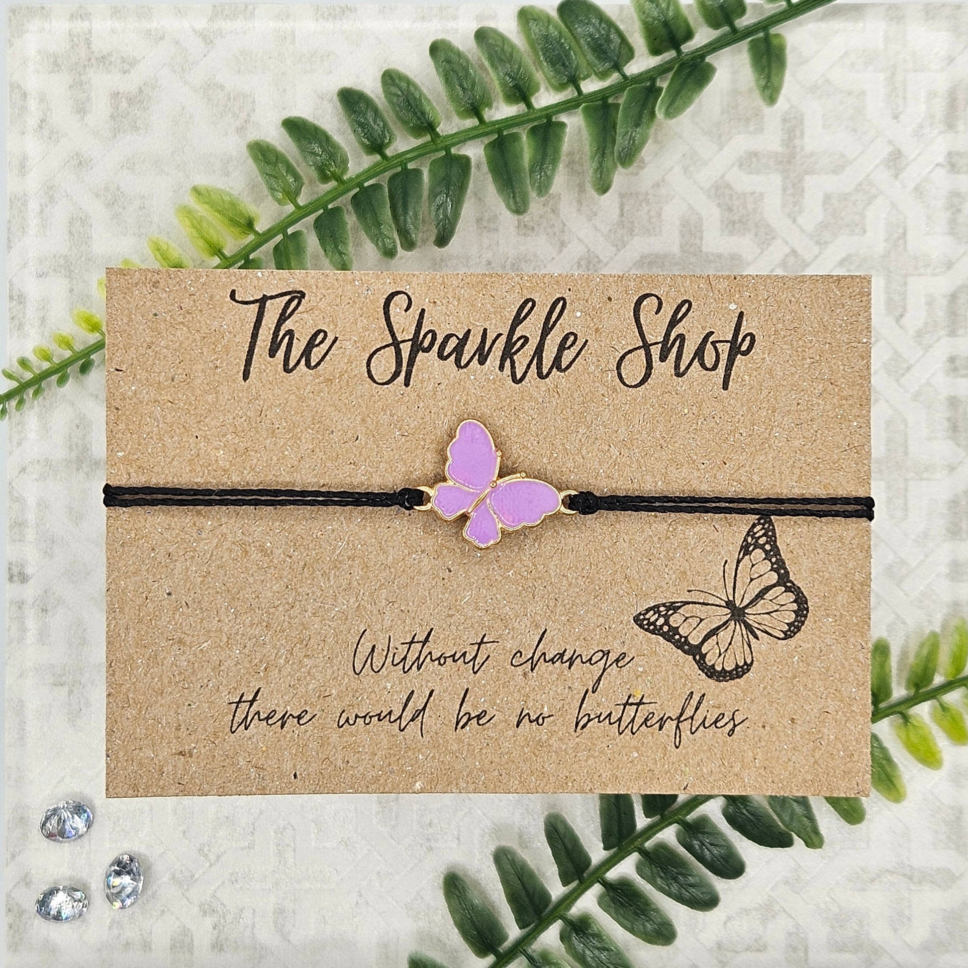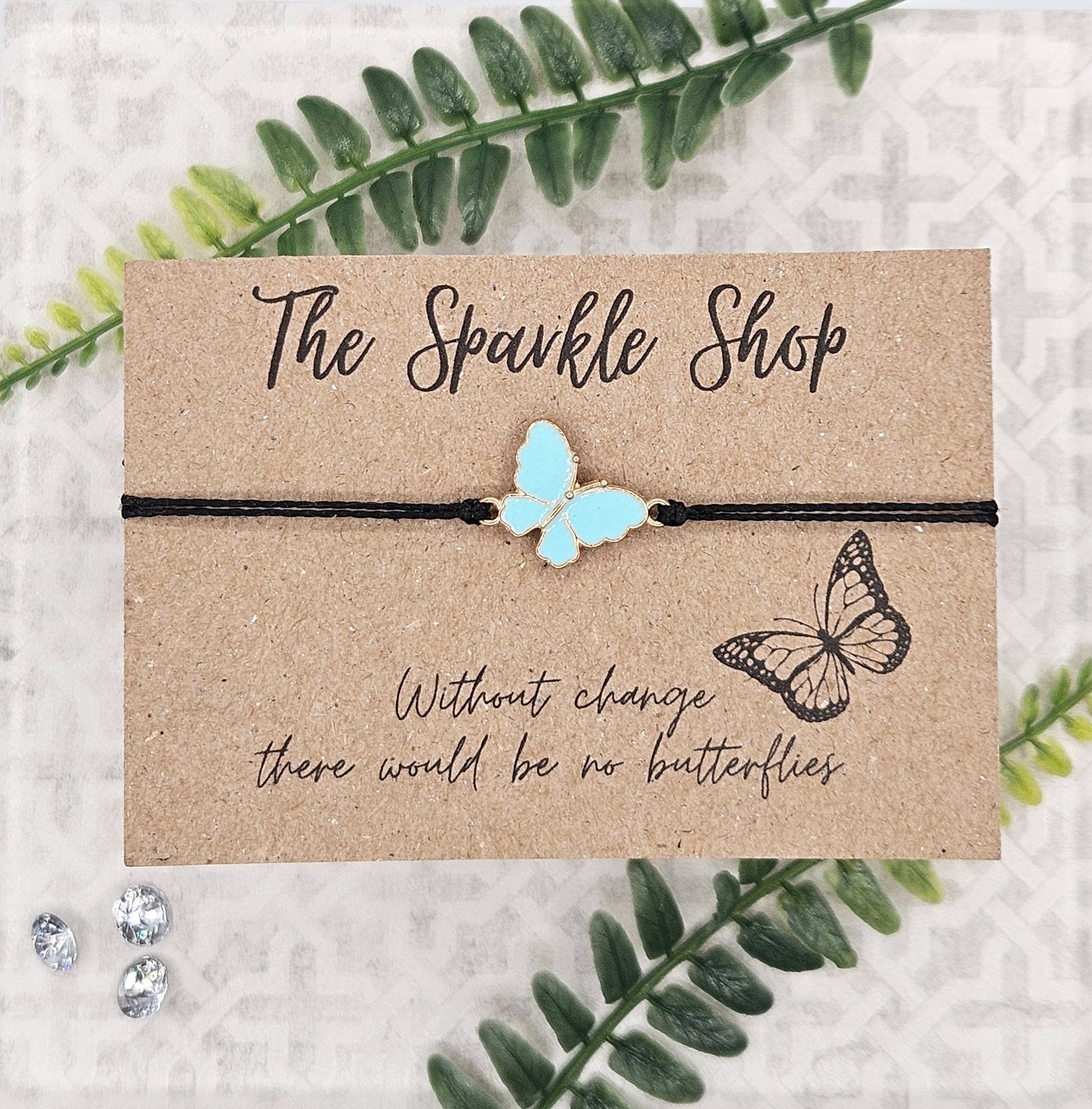 This handmade butterfly charm bracelet is a delightful accessory that combines style and sentimentality. It comes with a custom "Without change there would be no butterflies" jewelry card, making it a heartfelt gift for your loved ones. The adjustable wax cord ensures a comfortable fit for any wrist size, making it a versatile piece for all.
